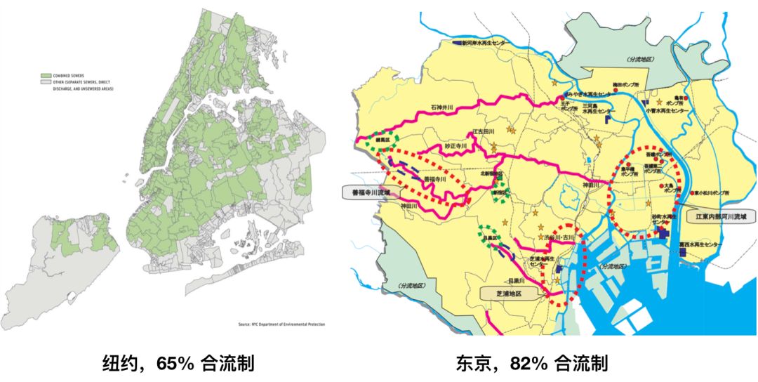我們來(lái)看看世界上其他城市。紐約2008年的數(shù)據(jù)里,有65%的區(qū)域是合流制區(qū)域,東京有82%的區(qū)域是合流制區(qū)域。