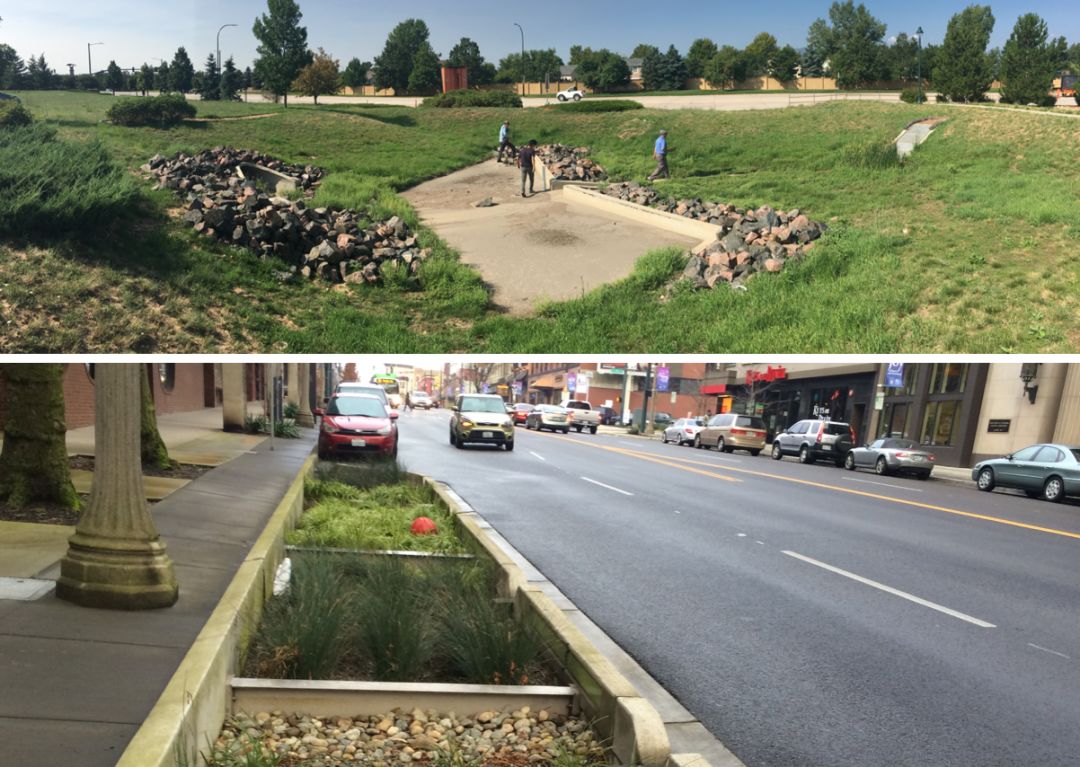 這張圖片也是丹佛。我們剛才說(shuō)在綠地和綠地之間,預(yù)留出徑流的通道,方法很簡(jiǎn)單,讓兩邊道路往中間傾斜,開(kāi)幾個(gè)小孔,就有了水可以走的路線。