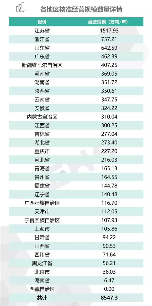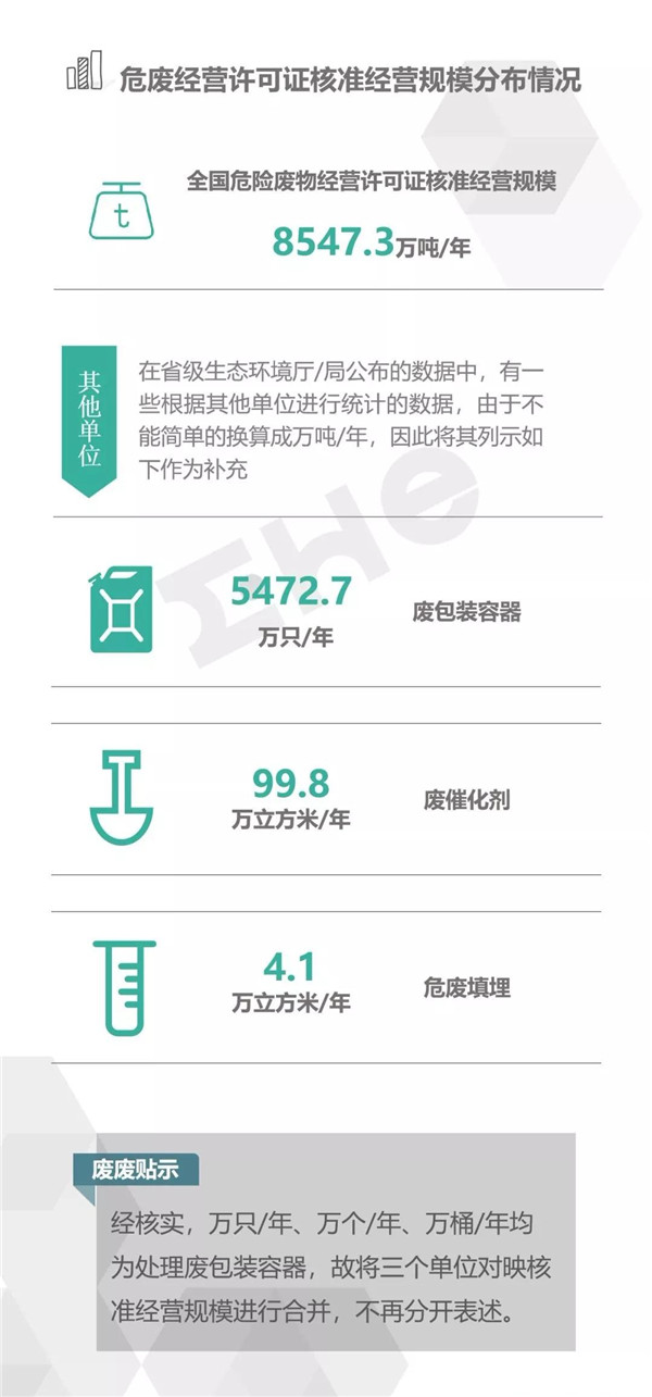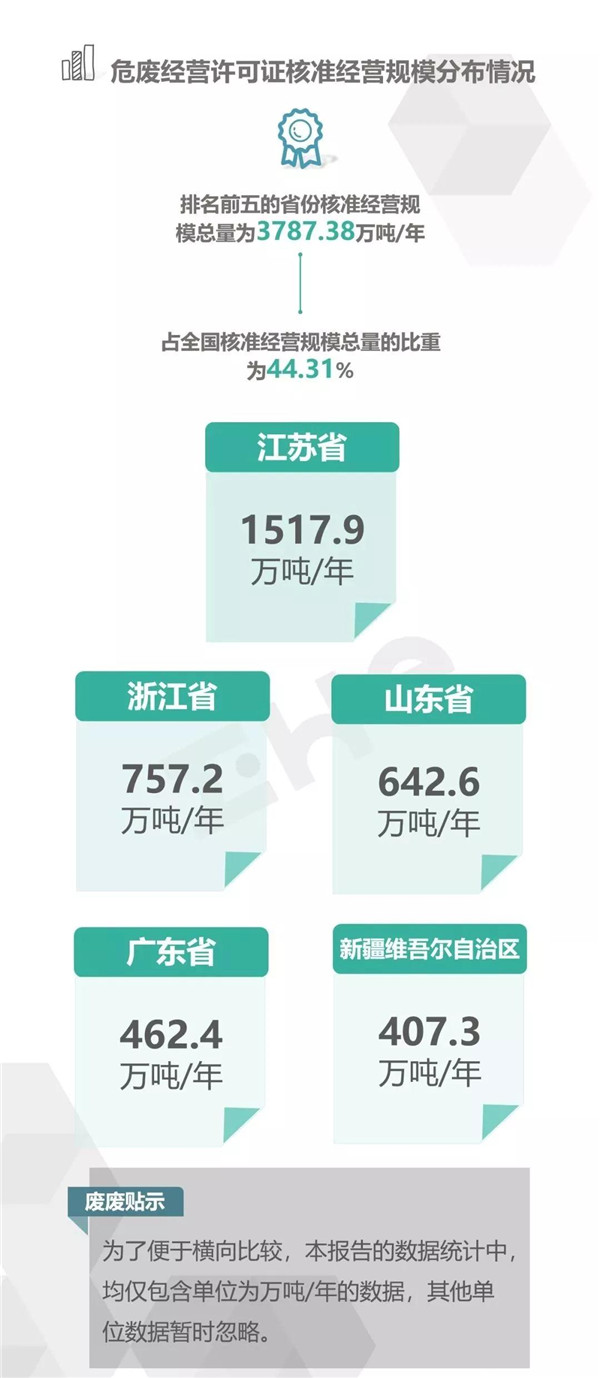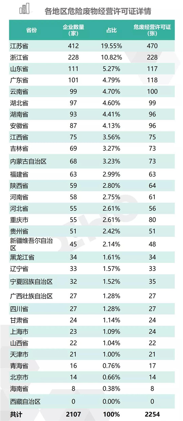 2.統(tǒng)計范圍:本次數(shù)據(jù)收集統(tǒng)計的范圍為省級生態(tài)環(huán)境廳(局)官方公布的持有危險廢物經(jīng)營許可證企業(yè)的數(shù)據(jù),因此由地級市發(fā)布的醫(yī)療廢物經(jīng)營許可證、收集經(jīng)營許可證,且未納入省級生態(tài)環(huán)境廳(局)公布數(shù)據(jù)的部分,并未計入統(tǒng)計數(shù)據(jù)中。