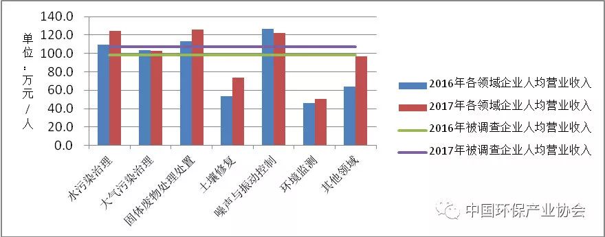 從勞動生產(chǎn)率看,規(guī)模以上被調(diào)查企業(yè)人均營業(yè)收入和企業(yè)平均營業(yè)收入均低于2017年規(guī)模以上工業(yè)企業(yè)平均值,反映了與傳統(tǒng)工業(yè)行業(yè)平均水平相比,環(huán)保產(chǎn)業(yè)生產(chǎn)效率較低。與2016年相比,2017年相同樣本企業(yè)的平均人均營業(yè)收入、企業(yè)平均營業(yè)收入均有所提高,分別提高了9.3%、15.4%。