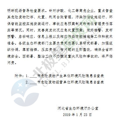 近日,河北省生態(tài)環(huán)境廳發(fā)布了關(guān)于春節(jié)期間加強危險廢物領(lǐng)域環(huán)境風(fēng)險防控工作的緊急通知,要求加大涉危險廢物領(lǐng)域重點行業(yè)企業(yè)的環(huán)境監(jiān)管力度,2月份,全省暫停實施跨界危險廢物轉(zhuǎn)運,特殊情況必須轉(zhuǎn)移的,一事一報。詳情如下: