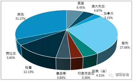 智利是全球最大的銅礦生產(chǎn)國(guó),2017年智利銅礦產(chǎn)量533萬(wàn)噸,占全球總產(chǎn)量的27.06%;秘魯銅礦產(chǎn)量239萬(wàn)噸,占全球總產(chǎn)量的12.13%;排在第三位的是美國(guó),銅礦產(chǎn)量127萬(wàn)噸,占全球總產(chǎn)量的6.45%。