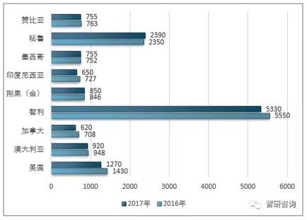 2017年全球銅礦產(chǎn)量分國(guó)家統(tǒng)計(jì)(單位:千噸)