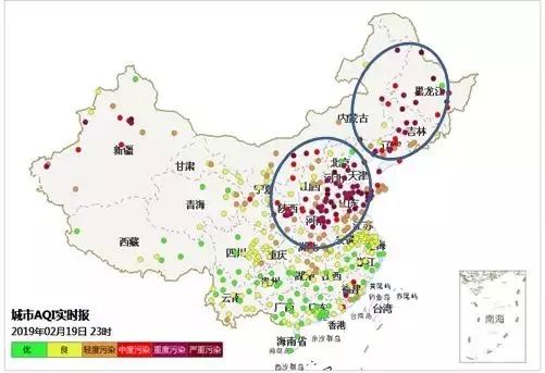 2019年2月19日至20日6時(shí)全國(guó)逐小時(shí)重污染城市數(shù)量及PM2.5濃度(圖片來(lái)源:生態(tài)環(huán)境部)