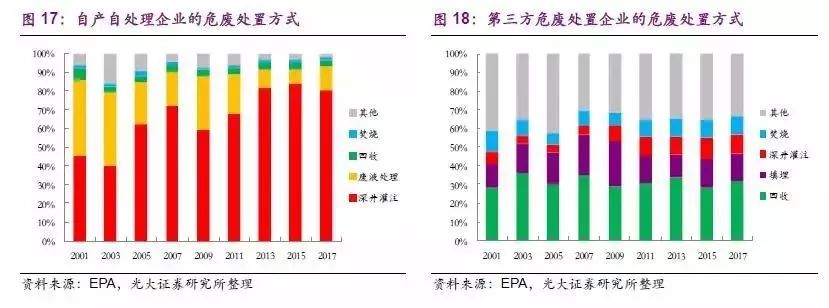 (3)危廢處置方式求同存異。整體來看,美國危廢處置方式的選擇已基本統(tǒng)一,深井灌注已成為美國危廢處置的主流方式,自2013年深井灌注處置危廢量的占比穩(wěn)定在70%左右,廢液處理(僅適用于液費(fèi))、能量回收、焚燒、填埋位列2-5 位。但是另一方面,第三方處置和自產(chǎn)自處理的危廢處置方式有著較大的不同。石油、化工等大型企業(yè)多使用深井灌注處理自己產(chǎn)出的危廢(占比達(dá)80%以上),因其處置手段安全且成本相對較低;而第三方處置企業(yè)的主流處置方式則是回收利用(包括能量、金屬、溶劑等,占比近30%),填埋、焚燒、深井灌注等處置方式的占比均在10%左右。處置方式差異化的主要原因是自產(chǎn)自處理企業(yè)多為石油和化工企業(yè),危廢種類多為液費(fèi),深井灌注具有顯著的成本優(yōu)勢;而第三方處置企業(yè)接收的危廢種類更加多樣化,液費(fèi)占比也相對較低(30%左右),回收、焚燒、填埋等處置方式更符合其成本控制和利益獲取的要求,所以上述處置方式的占比更多。
