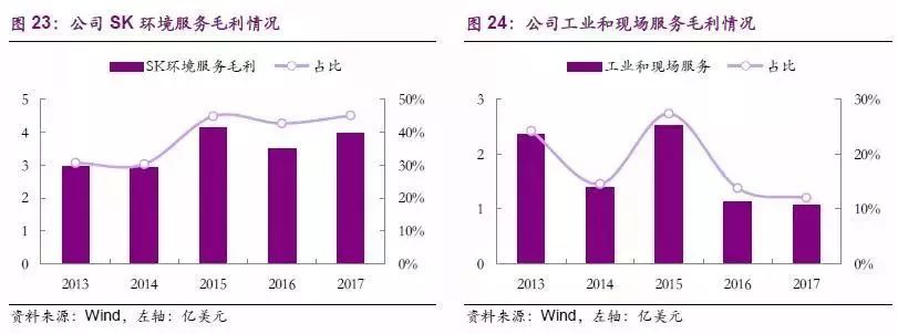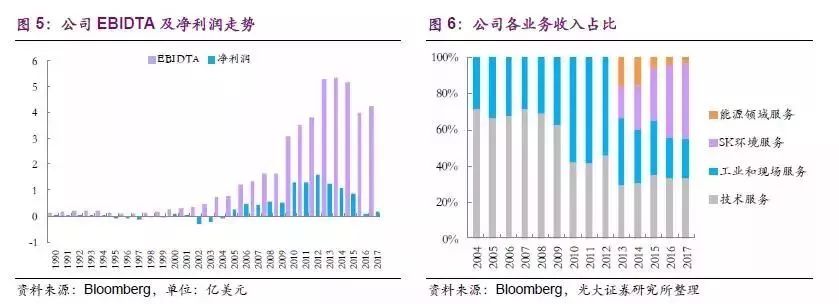 除傳統(tǒng)的技術(shù)服務(wù)之外,公司還提供SK環(huán)境及性能產(chǎn)品服務(wù)、工業(yè)和現(xiàn)場服務(wù)、以及能源領(lǐng)域(石油天然氣和住宿)服務(wù)三大業(yè)務(wù),努力向“一站式服務(wù)”的服務(wù)提供商靠攏。其中,前兩種業(yè)務(wù)和傳統(tǒng)的技術(shù)服務(wù)共同構(gòu)成了公司的核心增長動力,三者營業(yè)收入占比高達(dá)96%;而能源領(lǐng)域服務(wù)在未來有望隨著美國頁巖氣革命的發(fā)展給公司帶來新的增量。