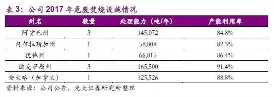 危廢焚燒方面,公司擁有北美共13個商業(yè)危險(xiǎn)廢物焚化爐中的9個,是北美這類設(shè)施的最大運(yùn)營商。公司垃圾焚燒實(shí)際處理能力為561,721噸,2017年的平均使用率為87.6%。
