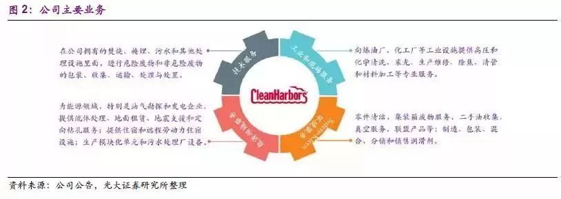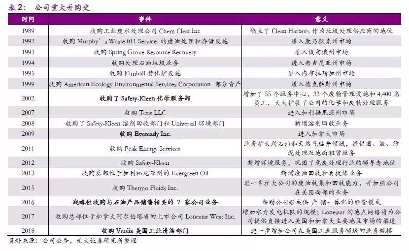 公司上在原有危廢處理技術(shù)的基礎(chǔ)上,通過兼并收購增添一系列新的服務(wù)領(lǐng)域。2008年,公司通過收購Safety-Kleen 溶劑回收部門和Universal 環(huán)境部門,開始涉足溶劑回收市場,新增大量業(yè)務(wù)。2009年,公司收購Eveready,在進(jìn)軍加拿大市場的同時(shí),擴(kuò)大了公司能源和工業(yè)服務(wù)范圍。能源和工業(yè)部門為石油和天然氣勘探和生產(chǎn),煉油,石化,紙漿和造紙以及電力公用事業(yè)終端市場等提供一系列服務(wù)。此前,Clean Harbors 在這一領(lǐng)域的傳統(tǒng)業(yè)務(wù)相對較小,收購Eveready 將公司的能源和工業(yè)服務(wù)收入從3千萬增加到5.5~6億,使其從一個小眾玩家成長為了市場上該項(xiàng)業(yè)務(wù)強(qiáng)有力的競爭對手。2011年,公司收購 Peak Energy Services,提供固、液、污泥處理及地面租賃服務(wù),將業(yè)務(wù)擴(kuò)大到石油和天然氣鉆井領(lǐng)域。2012年,公司收購北美領(lǐng)先的廢油回收和再精煉、零件清潔及環(huán)境解決方案公司Safety-Kleen,是公司歷史上最大規(guī)模收購。對Safety-Kleen的并購使得公司成為北美最大的二手油重磨機(jī)和回收商。此次收購新增了環(huán)境服務(wù)業(yè)務(wù),進(jìn)一步鞏固了公司危廢處理行業(yè)的領(lǐng)導(dǎo)者地位。公司在2013年和2015年相繼收購了總部位于加利福尼亞州的Evergreen Oil 及 Thermo Fluids Inc.,提升公司廢油回收和再精煉能力,進(jìn)一步增強(qiáng)業(yè)務(wù)能力。