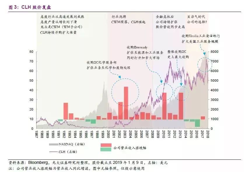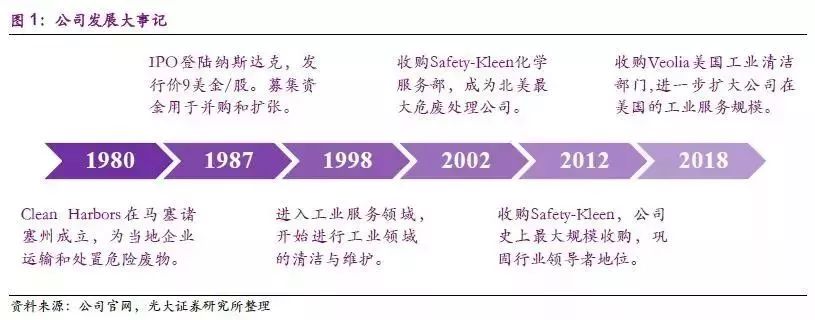 公司于1980年在馬薩諸塞州成立,1989年通過收購工業(yè)廢水處理公司Chem Clear Inc. 確立了CLH 作為垃圾處理供應(yīng)商的地位。1992-1995年,公司先后收購Murphys Waste 011 Service 的廢油處理和存儲設(shè)施、SpringGrove Resource Recovery、處理石油垃圾業(yè)務(wù)、Kimball 焚化爐設(shè)施,逐步進(jìn)入康乃狄克州市場、俄亥俄州市場、弗吉尼亞州市場、內(nèi)布拉斯加州市場,將公司從東海岸發(fā)展到中部。1999年和2007年,公司先后收購AmericanEcology Environmental Services Corporation 部分資產(chǎn)、Teris LLC,進(jìn)入德克薩斯州市場及加利福尼亞市場,將業(yè)務(wù)拓展到西部。2009年,公司收購從事工業(yè)維護(hù)和生產(chǎn)、住宿和地震服務(wù)的加拿大公司Eveready,此次收購增加了2,100多名員工,79個地點(diǎn)和2400多輛卡車和拖車單元的服務(wù)車隊(duì),將業(yè)務(wù)拓展到加拿大,公司正式進(jìn)軍海外市場。此外,公司2002年收購 Safety-Kleen化學(xué)服務(wù)部,為公司增加了 55個服務(wù)中心、33個廢物管理設(shè)施、4400名員工,大大擴(kuò)展了公司的化學(xué)和廢物處理服務(wù),提升了核心競爭力。