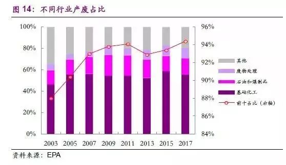 (1)危廢行業(yè)較依賴工業(yè),尤其是化工和油氣行業(yè)的發(fā)展。美國不同行業(yè)對危廢產(chǎn)量的貢獻(xiàn)度上,基礎(chǔ)化工制造業(yè)占比常年超50%,石油和煤制品制造業(yè)以及廢物處理行業(yè)也穩(wěn)居前三,且近20年來,排名前三和前十的行業(yè)的危廢產(chǎn)量占比在穩(wěn)步提高,進(jìn)一步推動了行業(yè)集中度的提升。