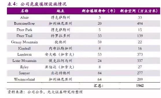 危廢填埋方面,公司在美國和加拿大共擁有11個活躍的垃圾填埋場,其中兩個是非商業(yè)垃圾填埋場,他們只接受來自公司焚化爐的垃圾。其余9個均為商業(yè)用垃圾填埋場,7個允許用于處置危險(xiǎn)廢物,另2個用于非處置危險(xiǎn)工業(yè)垃圾處理和城市固體垃圾處理。目前,這些商用垃圾填埋場的仍有約1942萬立方米的剩余容量。