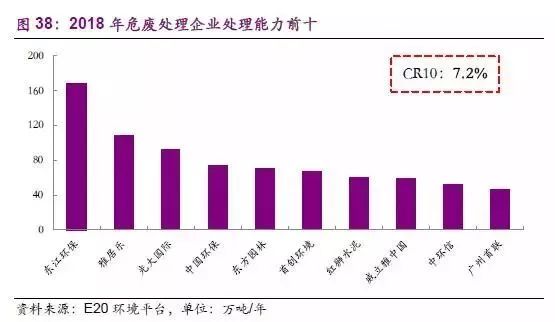 目前我國危廢市場的優(yōu)秀參與者眾多,隨著危廢處理“量價(jià)齊增”的情況延續(xù),從傳統(tǒng)危廢處理企業(yè)東江環(huán)保、光大綠色環(huán)保,到全產(chǎn)業(yè)鏈拓展的大型環(huán)保公司東方園林、北控水務(wù),再到資金實(shí)力雄厚的新興力量海螺創(chuàng)業(yè)、雅居樂,均在危廢行業(yè)持續(xù)開疆拓土。但是,我國的危廢市場行業(yè)集中度仍相對較低。根據(jù)E20環(huán)境平臺的統(tǒng)計(jì),雖然我國的危廢企業(yè)處理量快速增長,但是CR10的總產(chǎn)能僅占全國總產(chǎn)能的7.2%,仍有大量的危廢產(chǎn)能被小型企業(yè)所瓜分。