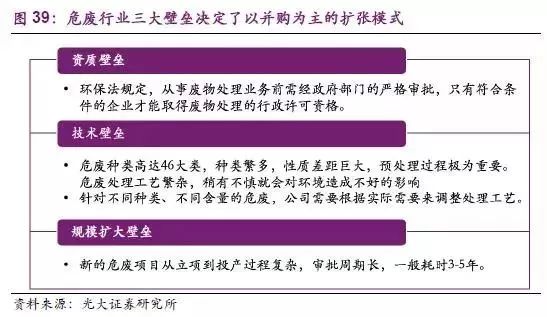 規(guī)模擴(kuò)大壁壘:新的危廢項(xiàng)目從立項(xiàng)到投產(chǎn)過程復(fù)雜,審批周期長,一般耗時(shí)3-5年。顯然,收購有資質(zhì)的企業(yè)會比新建產(chǎn)能更容易擴(kuò)大企業(yè)規(guī)模。