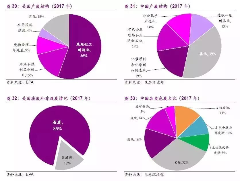 從產(chǎn)廢結(jié)構(gòu)上來看,美國是石油化工生產(chǎn)大國,其產(chǎn)廢結(jié)構(gòu)中基礎(chǔ)化工以及石油/煤制品制造業(yè)的產(chǎn)廢占比合計(jì)高達(dá)71%(2017年);由于石化企業(yè)多產(chǎn)生液態(tài)危廢,因而美國的危廢產(chǎn)量中83%為液態(tài)危廢。而我國的化工行業(yè)產(chǎn)廢僅占總量的19%,且產(chǎn)廢行業(yè)較為分散,有色金屬冶煉、非金屬礦采選、造紙等行業(yè)的產(chǎn)廢占比均超過10%。另一方面,液態(tài)危廢在國內(nèi)危廢總體結(jié)構(gòu)中占比較小,以目前的廢物結(jié)構(gòu)看,將廢堿(15.67%)、廢酸(14.37%)、廢油(5.36%)全看作液態(tài)危廢,合計(jì)占比僅為35%。