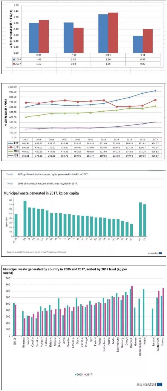 人均生活垃圾量是多是少,如何評(píng)價(jià)。有人說(shuō)少好,少說(shuō)明減量化做的好??礆W盟28個(gè)國(guó)家生活垃圾量統(tǒng)計(jì),人均量多的國(guó)家往往生活垃圾管理水平高,生活垃圾回收利用利用率也高,如2017年歐洲生活垃圾量統(tǒng)計(jì)數(shù)據(jù):丹麥748千克/人·年,瑞士706千克/人·年,德國(guó)633千克/人·年;人均生活垃圾量少的國(guó)家往往經(jīng)濟(jì)水平低,生活垃圾回收率低,如羅馬尼亞272千克/人·年,塞爾維亞306千克/人·年;2017年瑞士生活垃圾回收利用率為53%,丹麥為48%,而羅馬尼亞只有13%。