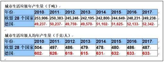 上表:歐盟、德國(guó)生活垃圾量統(tǒng)計(jì) 來(lái)源:EUROSTAT