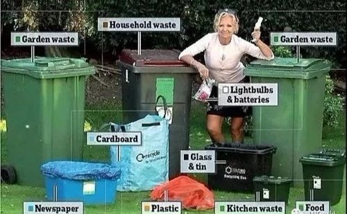 在英國(guó),每家每戶都有至少3種顏色的帶滾輪垃圾桶,并且垃圾桶上還會(huì)有各家的門(mén)牌號(hào)碼。垃圾桶由Cherwell(相當(dāng)于中國(guó)的社區(qū)居委會(huì))統(tǒng)一制作,居民自行購(gòu)買(mǎi)。垃圾回收費(fèi)用為一年145鎊。每周回收的垃圾桶顏色不同,這周收綠桶,下周收藍(lán)色和褐色的桶。