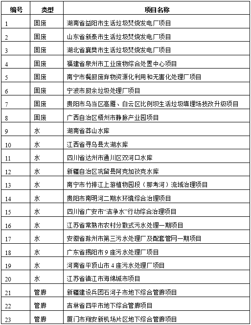 2017年5月24日,國家發(fā)展改革委選定了43個項目作為第二批PPP項目典型案例。環(huán)保類項目共23個,占比高達53.5%,其中,固廢類項目8個,水類項目12個,管廊類項目3個。具體的項目名單見下表: