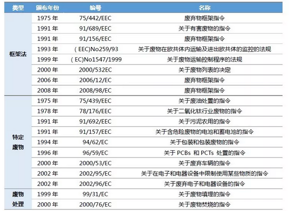 歐盟通過廢棄物框架指令確立了固廢處理的理念,建立了固廢處理體系,其相關(guān)的環(huán)境法律政策實際由兩部分組成,一部分是各類指令,從法律上直接對各成員國起約束作用,另一部分是定期頒布的環(huán)境行動規(guī)劃,對各成員國進(jìn)行目標(biāo)、內(nèi)容上的指導(dǎo)。