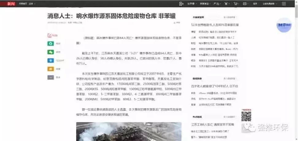 近日,針對響水爆炸事故,有文章指出,“據(jù)一位接近事故調(diào)查組的人士透露,本次事故的爆炸源是該廠的固體危險廢物儲存?zhèn)}庫,而非此前很多媒體報道的苯罐。”目前這一報道,已被多家主流媒體轉(zhuǎn)載。