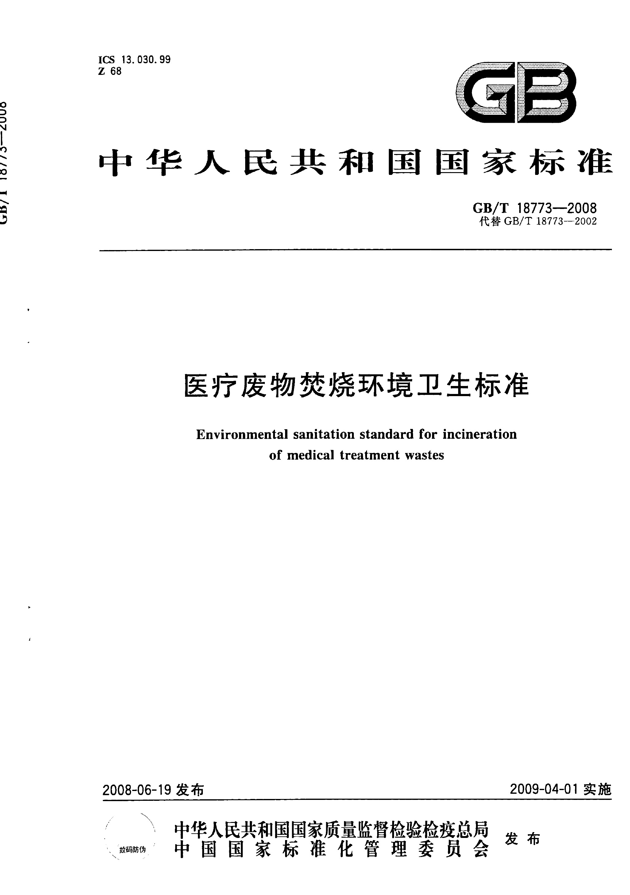 醫(yī)療廢物焚燒環(huán)境衛(wèi)生標(biāo)準(GB/T 18773-2008)