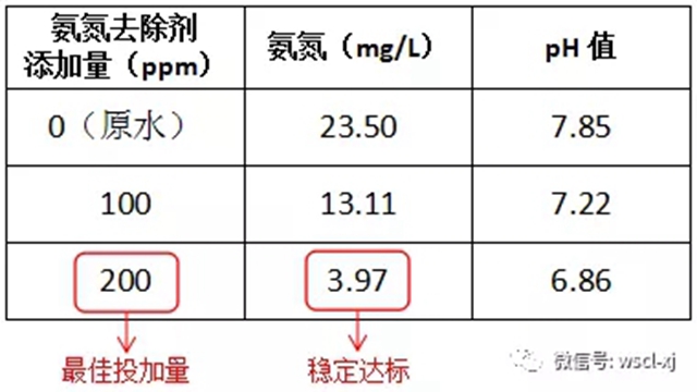 最終經過現場調試,氨氮去除劑確定在200ppm(每噸廢水加0.2kg)就可以將氨氮控制在5ppm以下。