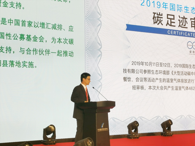 在生態(tài)環(huán)境部莊國(guó)泰副部長(zhǎng)、江蘇省人民政府郭元強(qiáng)副省長(zhǎng)等領(lǐng)導(dǎo)及嘉賓的見(jiàn)證下,北京中創(chuàng)碳投科技有限公司副總經(jīng)理錢國(guó)強(qiáng)先生宣讀了大會(huì)溫室氣體排放量并出具審核證書。江蘇省生態(tài)環(huán)境廳應(yīng)對(duì)氣候與國(guó)際合作處王華處長(zhǎng)為中創(chuàng)碳投頒發(fā)了碳中和紀(jì)念證書。