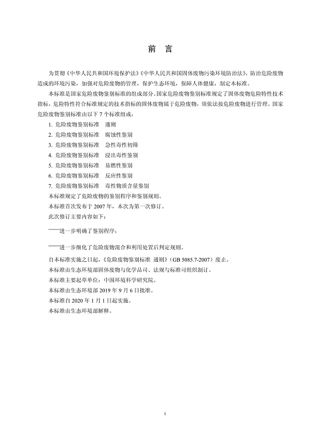 為貫徹《中華人民共和國(guó)環(huán)境保護(hù)法》《中華人民共和國(guó)固體廢物污染環(huán)境防治法》,防治污染,保護(hù)和改善生態(tài)環(huán)境,現(xiàn)批準(zhǔn)《危險(xiǎn)廢物鑒別標(biāo)準(zhǔn) 通則》為國(guó)家環(huán)境保護(hù)標(biāo)準(zhǔn),并由生態(tài)環(huán)境部與國(guó)家市場(chǎng)監(jiān)督管理總局聯(lián)合發(fā)布。