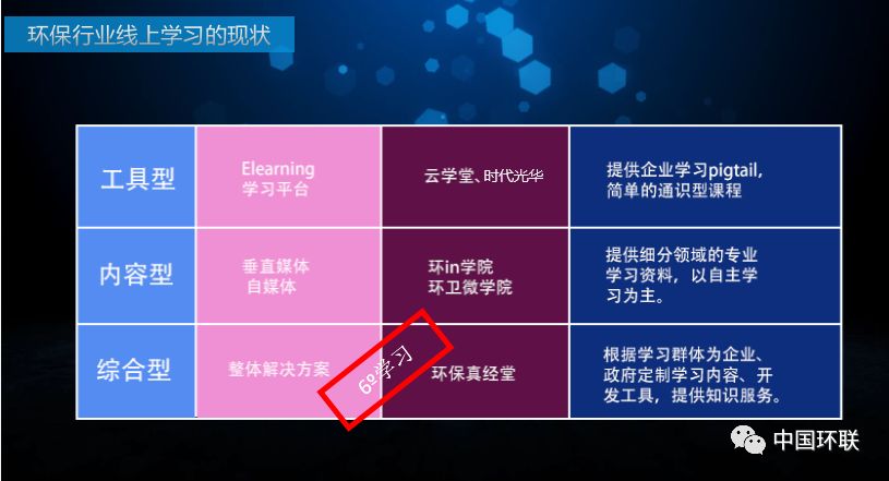 當前環(huán)保行業(yè)人才缺口達300萬,且存在現有人員崗位技能合格率低以及企業(yè)和個人自我賦能乏力的問題。大型企業(yè)在提升工作人員技能方面,一般采取企業(yè)內訓、購買培訓服務及外出參加培訓的方式,但95%的中小微企業(yè)由于資金、管理機制等方面的不足,面臨員工培訓機制不完善的困境。對此,阮洪銀提出了6o學習的模式:即將終身學習、系統化學習、組織化學習,學習與愛好多重,學習與生活多重,多對多,老師與學生角色多重,學習與營銷多重等六維度相結合,重新定義“知識”含義與獲取路徑,重新定義企業(yè)商業(yè)信息宣發(fā)路徑。