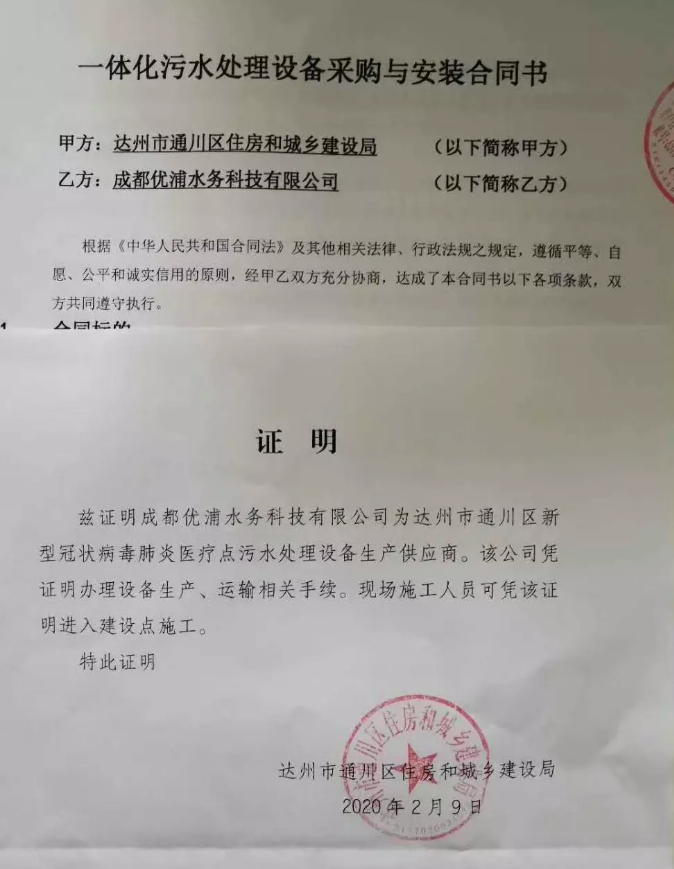 2月9日,因疫情防控需要,達州市通川區(qū)住房和城鄉(xiāng)建設局緊急指定優(yōu)普為達州市通川區(qū)新型冠狀病毒肺炎醫(yī)療點污水處理設備生產供應商,目前已經妥當組織好設備生產和安裝、調試計劃。