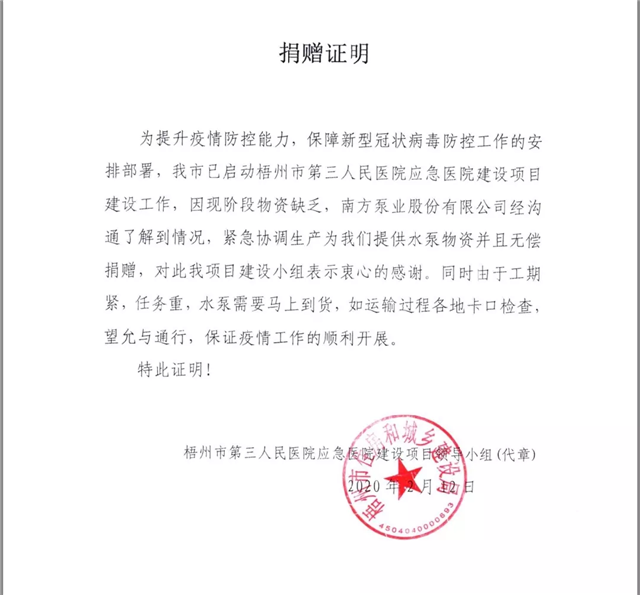 2020年春節(jié)前后爆發(fā)的新型冠狀病毒肺炎疫情截止到目前,全國確診人數已至數萬人,全國多個城市面臨著物資缺乏,緊急施工的嚴峻挑戰(zhàn)。為提升疫情防控能力,保障新型冠狀病毒防控工作的安排部署,加快湖北省婦幼保健院(光谷分院)施工建設,提高抗擊新型冠狀病毒肺炎疫情的能力,南方泵業(yè)股份有限公司相關工作人員積極參與到醫(yī)院的施工與建設。由于現處特殊時期,找不到物流公司運送,特將水泵和供水設備專車運往疫情災區(qū),為加快醫(yī)院建設作出貢獻。