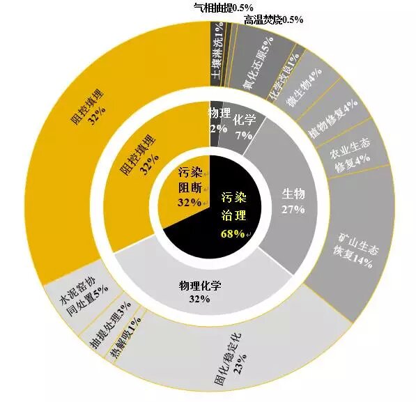 根據江蘇省(宜興)環(huán)保產業(yè)技術研究院及土盟對公開招投標項目的統(tǒng)計調查發(fā)現(xiàn),2008-2016年,我國177個土壤修復項目中,土壤修復以污染介質治理技術為主,占比68%;污染途徑阻斷技術占比32%。在污染介質治理技術中,物理化學和生物技術成為主要技術,分別占比32%和27%;物理、化學單一類技術應用占比相對較小,分別為2%和7%(圖 1)。