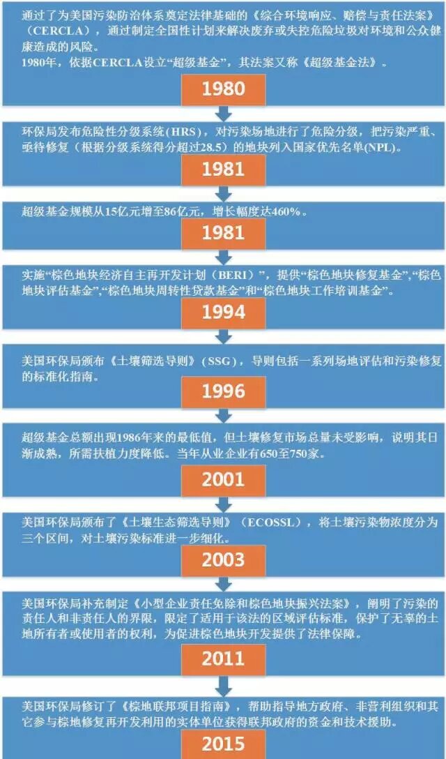 在全球范圍內,美國土壤修復產業(yè)起步最早,發(fā)展最快,其發(fā)展歷程和經驗值得各國學習借鑒。美國建立了完善的法律體系,包括歷經數(shù)次修訂的核心法案《超級基金法》,補充法案《小型企業(yè)責任免除和棕色地塊振興法案》,還有《固體廢物處置法》《清潔水法》《安全飲用水法》《有毒物質控制法》等輔助法案;美國有較為充足的資金支持,以超級基金為主要資金來源,以棕色地塊經濟自主再開發(fā)計劃(BERI)等為補充資金支持;美國制定了土壤篩選導則(SSG)和土壤生態(tài)篩選導則(ECO-SSL)在內的技術標準。
