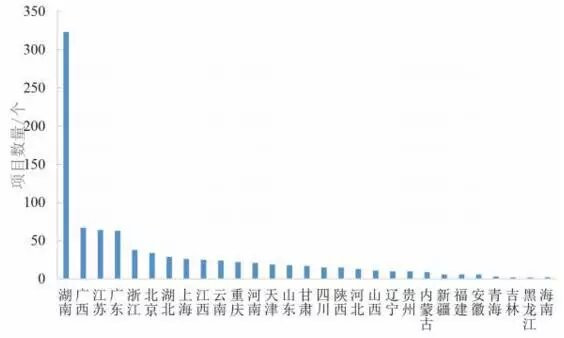 從目前所采集到的數(shù)據來看,已有29 個省(自治區(qū)、直轄市)發(fā)布過土壤修復項目,如圖 4 所示。在發(fā)布項目的數(shù)量上,湖南、廣西、廣東、江蘇、浙江、北京各地較為領先,其中湖南省土壤修復項目數(shù)量居全國首位。