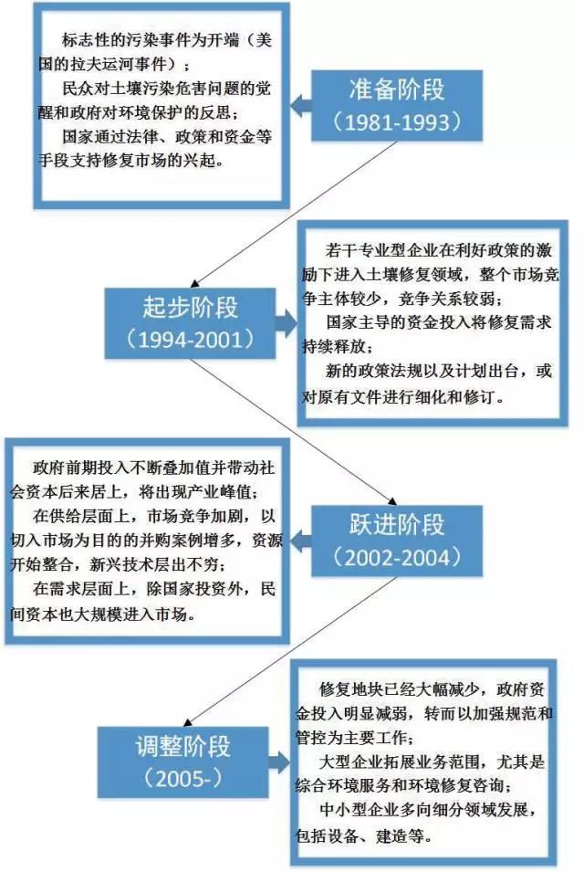 可以說,要想勾畫完整的土壤修復產業(yè)生命周期,經歷較為完全而且環(huán)保局數(shù)據齊全的美國是首選的分析對象,如圖 1 所示。