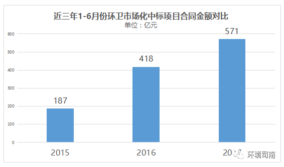 2015年之前,環(huán)衛(wèi)市場(chǎng)化進(jìn)程相對(duì)比較平靜。進(jìn)入2016年,環(huán)衛(wèi)市場(chǎng)化呈現(xiàn)出跳躍式增長(zhǎng)態(tài)勢(shì),合同金額同比(與2015年相對(duì))增幅高達(dá)223%。2017年我國(guó)的環(huán)衛(wèi)市場(chǎng)化延續(xù)了2016年的強(qiáng)勁走勢(shì),截止1-6月份合同金額接近600億元,全年將輕松跳過1000億元關(guān)口。