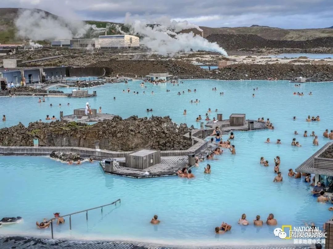 在冰島藍(lán)湖,地?zé)崴赐ㄟ^(guò)斯瓦森基發(fā)電廠產(chǎn)生電力后不再滾燙,被用來(lái)建立熱門(mén)旅游景點(diǎn)。水中高濃度的硅防止其下滲進(jìn)熔巖原,并為湖水染上迷人的藍(lán)色。