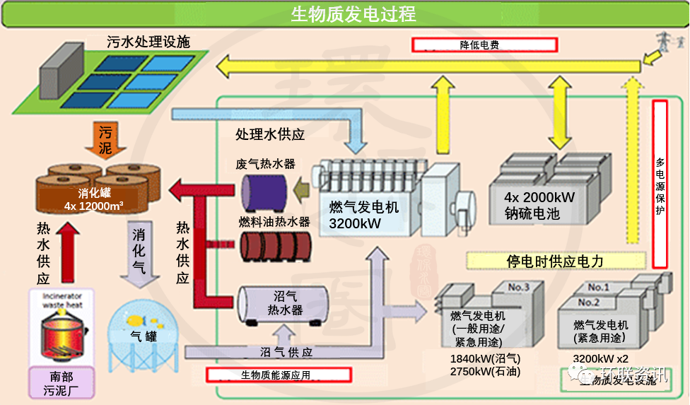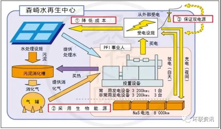 森崎水回收中心東部還設(shè)有有四個(gè)消化罐,用來從有機(jī)污泥成分中產(chǎn)生甲烷氣體,這將減少最終的污泥體積。每個(gè)消化罐內(nèi)徑28米,深度19.5米(容積12000立方米),消化溫度約為50攝氏度。為了構(gòu)建可持續(xù)發(fā)展和循環(huán)型社會(huì),為下一代營(yíng)造宜人的全球環(huán)境,森崎水回收中心正在努力利用污水處理過程中產(chǎn)生的能量,污泥和再生水來獲得資源和能源。夏季的廢水溫度低于夏季,冬季的溫度高于大氣溫度,“城市供熱”系統(tǒng)正是利用廢水溫差來實(shí)現(xiàn)區(qū)域供熱和制冷的。“城市供熱”系統(tǒng)的采用減少了化石燃料(石油,天然氣等)的使用,并有助于減少空氣污染物和電力消耗。項(xiàng)目開始時(shí)間:2006年10月將從水再生中心獲得的處理后的廢水供應(yīng)到新的索尼公司大樓,以冷卻大樓的空調(diào)設(shè)備??照{(diào)產(chǎn)生的廢熱,通過熱交換器處理后被廢水吸收。該項(xiàng)目的環(huán)境影響是,由于冷卻設(shè)備運(yùn)行所需的電力和自來水的減少,CO2排放量每年減少約22 t。此外,與將所有熱量釋放到大氣中的常規(guī)方法相比,該項(xiàng)目中的熱量釋放到處理后的廢水中,有助于應(yīng)對(duì)熱島現(xiàn)象。 生物質(zhì)發(fā)電(與私營(yíng)企業(yè)合作)廢水處理方法中產(chǎn)生的污泥在消化池中加熱,然后污泥中的有機(jī)物變成甲烷氣,減少了污泥量。過程中產(chǎn)生的甲烷是生物質(zhì)(可再生)能源,可以被用作發(fā)電設(shè)備的燃料,每年可發(fā)電22.8 kWh。在發(fā)電設(shè)施的安裝和管理方面,森崎率先引進(jìn)了PFI(私人融資計(jì)劃:是一種公私合作的方法,將資金、技術(shù)知識(shí)和管理技能從私營(yíng)部門帶到公共機(jī)構(gòu)),它可以降低設(shè)施建設(shè)或維護(hù)/管理的成本。它也通過可交易的綠色證書作為環(huán)境價(jià)值能源轉(zhuǎn)讓給第三方。該中心還安裝了世界上最大的NaS電池設(shè)備,用于全天的分布式電力負(fù)載:在夜間有效地使用低成本的電力,并在用電高峰期減少使用電池供電。