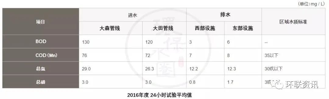 進(jìn)水和出水的平均質(zhì)量(2016年度24小時(shí)試驗(yàn)平均值)