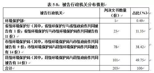 數(shù)據(jù)顯示,2016年全年,縣級環(huán)境保護局作為被告行政機關(guān)的裁決文書數(shù)量達101份, 占比最高,達到49.75%。其中,縣級環(huán)境保護局與縣級政府作共同被告有14份。