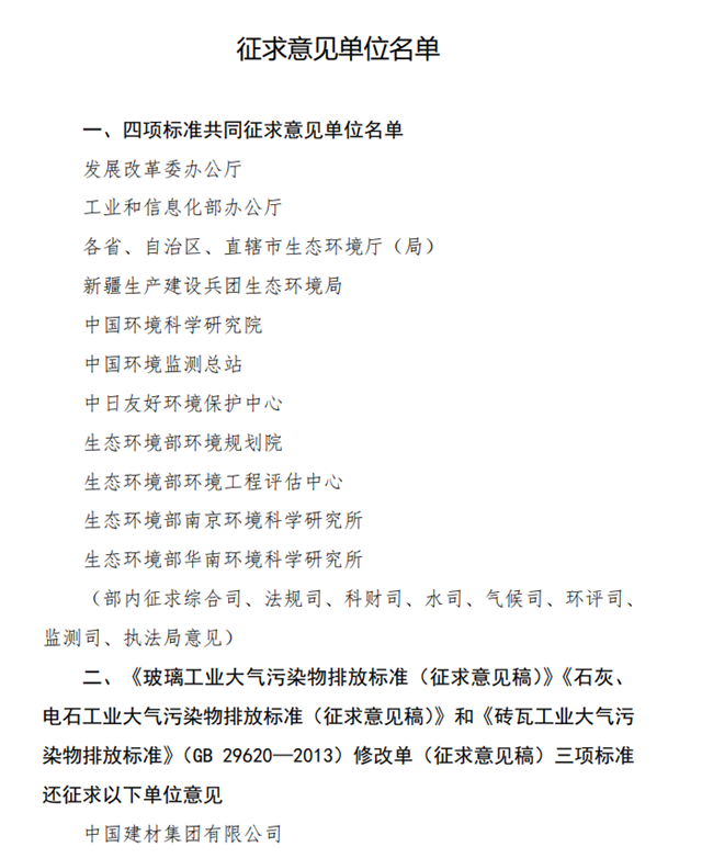 近日,生態(tài)環(huán)境部發(fā)布關(guān)于征求《玻璃工業(yè)大氣污染物排放標(biāo)準(zhǔn)(征求意見稿)》、《石灰、電石工業(yè)大氣污染物排放標(biāo)準(zhǔn)(征求意見稿)》、《磚瓦工業(yè)大氣污染物排放標(biāo)準(zhǔn)修改單(征求意見稿)》和《無機(jī)化學(xué)工業(yè)污染物排放標(biāo)準(zhǔn)修改單(征求意見稿)》四項(xiàng)國家環(huán)境保護(hù)標(biāo)準(zhǔn)意見的函。