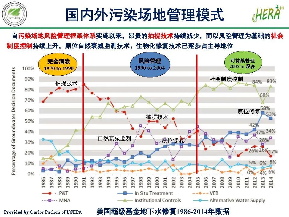 我國(guó)自污染場(chǎng)地風(fēng)險(xiǎn)管理框架體系實(shí)施以來,昂貴的抽提技術(shù)持續(xù)減少,而以風(fēng)險(xiǎn)管理為基礎(chǔ)的社會(huì)制度控制持續(xù)上升,原位自然衰減監(jiān)測(cè)技術(shù),生物化修復(fù)技術(shù)已逐步占主導(dǎo)地位。本文從專家視角綜述了場(chǎng)地土壤與地下水污染風(fēng)險(xiǎn)管控技術(shù)。