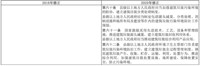 明確建筑垃圾分類及消納要求。新版固廢法對建筑垃圾的處理提出了明確要求,對縣級以上人民政府的治理和規(guī)劃責任加以明確,并要求工程施工單位對所產(chǎn)生的建筑垃圾提供資源化消納預案,對過去相對散亂的建筑垃圾問題進行了重點關注。商業(yè)模式上來看建筑垃圾資源化項目運營性較強,且有使用者付費基礎,有完全商業(yè)化的可能。(推薦閱讀:餐廚280元/噸建筑30元/噸,光大國際斬獲泗陽固廢項目)。但來料和資源化產(chǎn)品的雙向需求風險均不穩(wěn)定,使得建筑垃圾資源化項目商業(yè)模式尚不完善,市場空間的釋放相對較為緩慢。相信在“無廢城市”,及此次固廢法修訂的刺激下將迎來新勢能。建筑垃圾資源化有望成為固廢領域下一個垃圾焚燒。