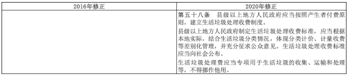 首提生活垃圾收費要求。這一條文與國家發(fā)展改革委關于創(chuàng)新和完善促進綠色發(fā)展價格機制的意見中關于生活垃圾處理費的指導思想高度一致(參考鏈接:透視發(fā)改943文:垃圾收費、分類雙管齊下,固廢管理進入體系化)。E20研究院固廢產(chǎn)業(yè)研究中心負責人潘功博士認為,對生活垃圾的計量收費和差別化收費,融入了生活垃圾分類理念,明確了“污染者付費”原則,是推動生活垃圾分類的有效手段、有力手段、強制手段。全面垃圾收費的號角,伴隨強制垃圾分類的“再擴容”和固廢法修訂的再次強調而正式吹響,通過全面建立覆蓋成本并合理盈利的固體廢物處理收費機制,加快建立有利于促進垃圾分類和減量化、資源化、無害化處理的激勵約束機制,將成為垃圾分類工作的一個重要突破口。