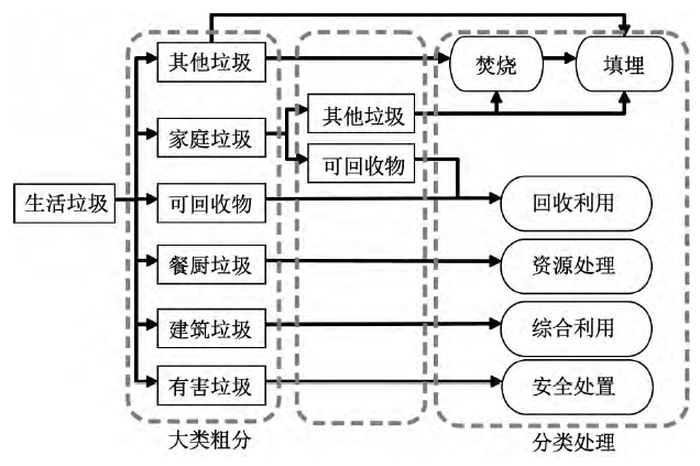 2)分類處理設(shè)施能力不足。我國(guó)大部分城市面臨處理能力跟不上垃圾增長(zhǎng)速度的問(wèn)題;此外,源頭分類后沒(méi)有相應(yīng)的處理設(shè)施,導(dǎo)致末端再次混合,造成人力浪費(fèi),并增加經(jīng)濟(jì)成本。