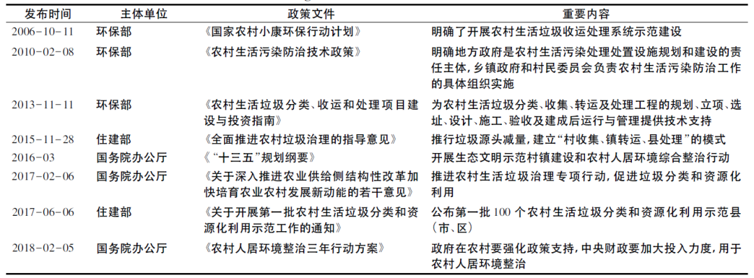 2016年12月21日,在中央財(cái)經(jīng)領(lǐng)導(dǎo)小組第十四次會(huì)議上,習(xí)近平總書記提出“要加快建立分類投放、分類收集、分類運(yùn)輸、分類處理的垃圾處理系統(tǒng),形成以法治為基礎(chǔ)、政府推動(dòng)、全民參與、城鄉(xiāng)統(tǒng)籌、因地制宜的垃圾分類制度,努力提高垃圾分類制度覆蓋范圍”。分別對(duì)近年來(lái)我國(guó)有關(guān)城市和農(nóng)村垃圾分類的主要政策進(jìn)行梳理,如表1和表2所示。