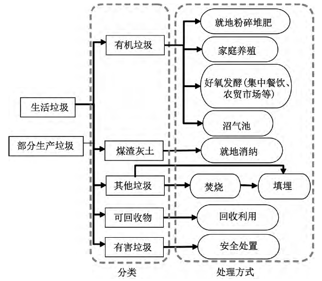 3)采用區(qū)域統(tǒng)籌方式解決其他垃圾的終端處置。農(nóng)村生活垃圾產(chǎn)生源分散,因此考慮到運(yùn)輸成本和經(jīng)濟(jì)性,不宜建設(shè)小型處理設(shè)施;而其他垃圾不存在易腐等問(wèn)題,適宜與城市生活其他垃圾進(jìn)行集中處置、統(tǒng)籌管理。