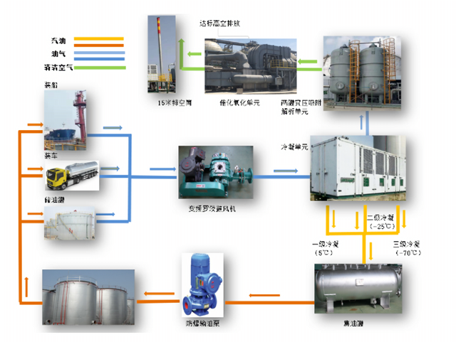 在產品罐區(qū)及碼頭裝船區(qū),油氣經過“收集-輸送-冷凝(吸收)-催化氧化”等工藝處理,最終達標排放。
