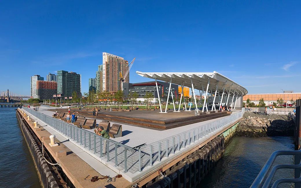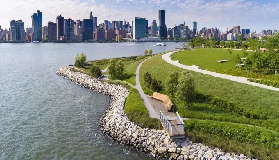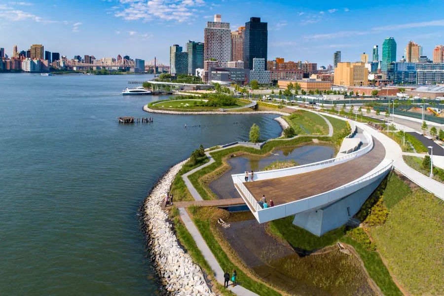 公園的二期工程起始于第54大道以南,整個設(shè)計地形豐富,通過不同的地勢,營造了許多有趣的空間。它包括一個半島空間、一個皮劃艇碼頭、幾個可以鍛煉和野餐的露臺,還有一個盤旋在濕地上空出挑的休息平臺,站在上面可以欣賞曼哈頓迷人的天際線。