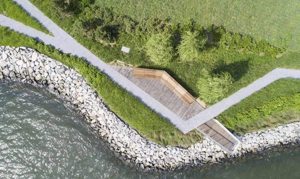 景觀半島:本設(shè)計重組了基地原有的半島空間,使其給人一種置身于小島上的錯覺。游客們沿著一條環(huán)繞著整個河岸線的連綿步道行走,通過一座步行橋到達重組的“小島”上。